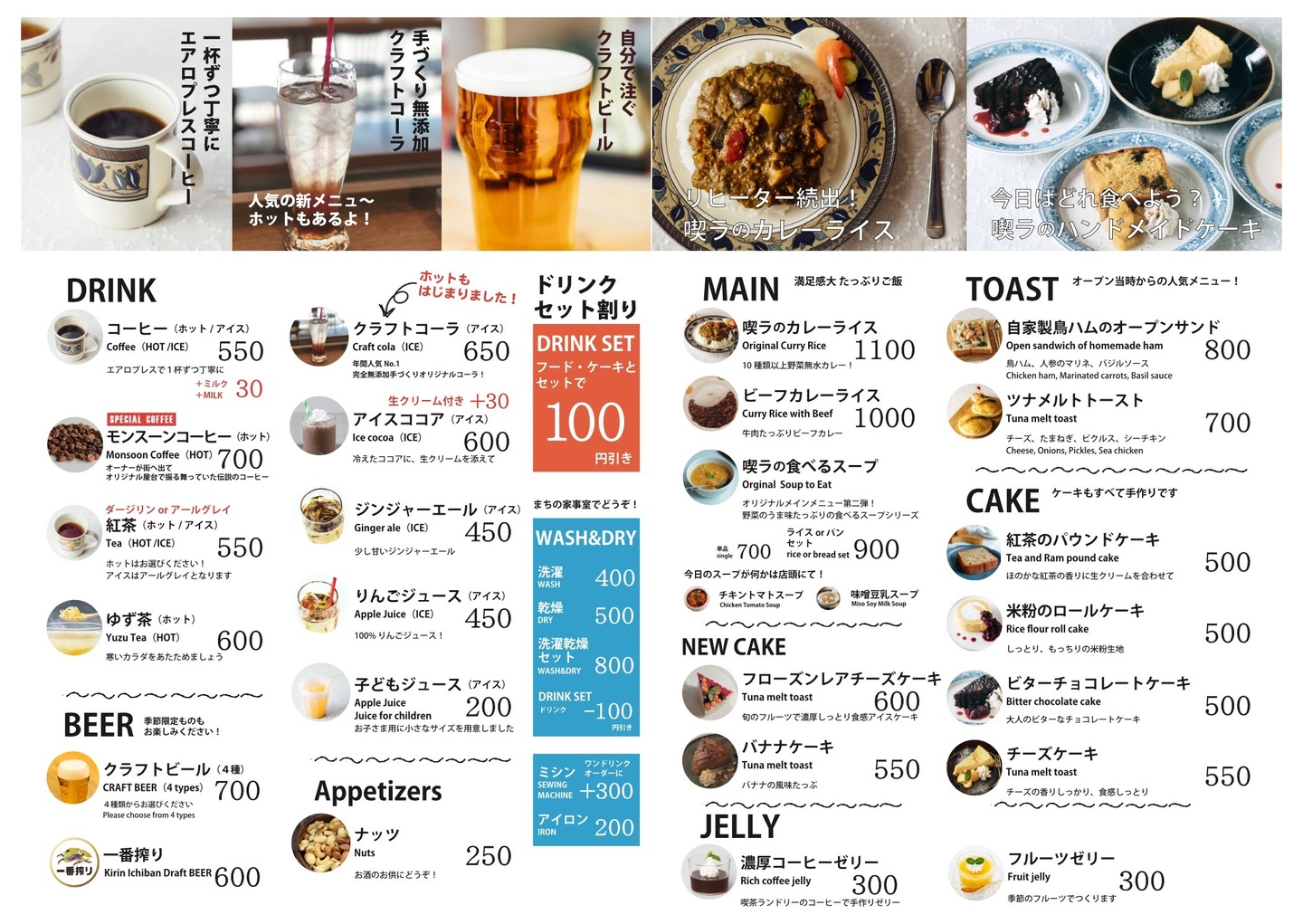 「喫茶ランドリー」は、東京は森下駅と両国駅の間、墨田区千歳の住宅街にオープンした、現代版の喫茶店です。築55年の建物の1階、元は手袋の梱包作業場として使われていた空間をリノベーションしました。お店では、コーヒーやお茶、軽食はもちろん、ランドリー(洗濯機)や大きめのテーブル、アイロンやミシン、お裁縫箱や編み物道具なども用意することにしました。リビングとして、読書室として、 家事室として、工房として。そのときにしてみたいことのために、あるいは、何もしたくないということのために、気ままにご使用ください。ひとりですることを、たまには誰かと。おうちですることを、たまにはここで。喋ったり、笑ったり、挑戦したり、集中したりを楽しんでいただけたら幸いです。