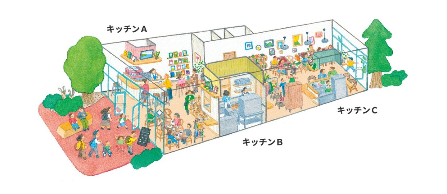 3 フロア席:お店の奥に3つのキッチン共有の座席をつくります。おひとりで、お友だちやご家族と、ゆったりお過ごしくださいね。キッチンCと合わせてお食事会などの貸切サービスも今後つくっていく予定です。